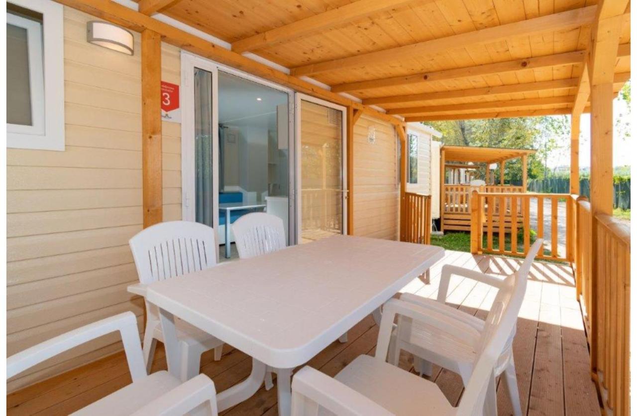Mobilheime für eine vierköpfige Familie. Das Haus verfügt über eine Terrasse, ein Schlafzimmer mit einem Doppelbett und ein weiteres mit zwei getrennten Betten, ein Badezimmer mit Dusche, eine Toilette, eine Küchenzeile und ein Wohnzimmer. Die Häuser sind klimatisiert.