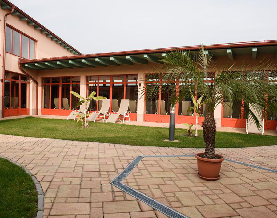 Hotel guests can use the thermal spa with a water surface of 1600 m² (indoor 25 m long swimming pool 25-27 °C, indoor training pool 30 °C, cooling pool by the sauna 10-12 °C, indoor thermal healing pool 33-34 °C, combined indoor and outdoor sitting pool with healing water 36-37 °C, outdoor children's pool with slide 30-32 °C - summer operation, children's play pool 28-30 ºC - summer operation, adventure pool with an area of 560 m² - summer operation). Sauna, steam cabin, relaxation areas, hairdressing salon, manicure, pedicure, cosmetics, solarium, medical procedures and wellness massages, aerobics.