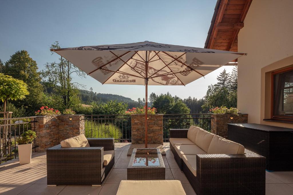 Odkryj spokój rodzinnego pensjonatu Na kraji lesa połączonego z nowoczesną restauracją. Zrelaksuj się, zamknij oczy i oddaj się urzekającym zabiegom wellness w Na kraji lesa. Zanurz się w niezwykłym świecie relaksu i odpoczynku. Możesz wygodnie usiąść w przytulnej restauracji, salonie lub na pięknym letnim tarasie z widokiem na okolicę. Relaks zapewni również pokój relaksacyjny i sauna parowa. Pobyt ze zwierzętami jest możliwy tylko za dodatkową opłatą. Bezpłatny parking znajduje się bezpośrednio przy pensjonacie.