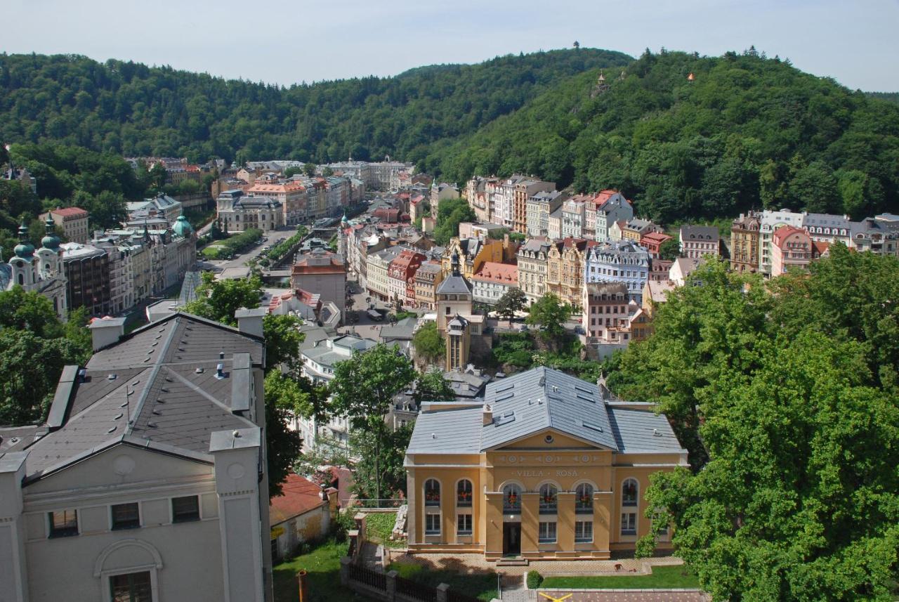 Villa Rosa se nachází na kopci nad Karlovými Vary a nabízí panoramatický výhled na oblíbené lázeňské letovisko